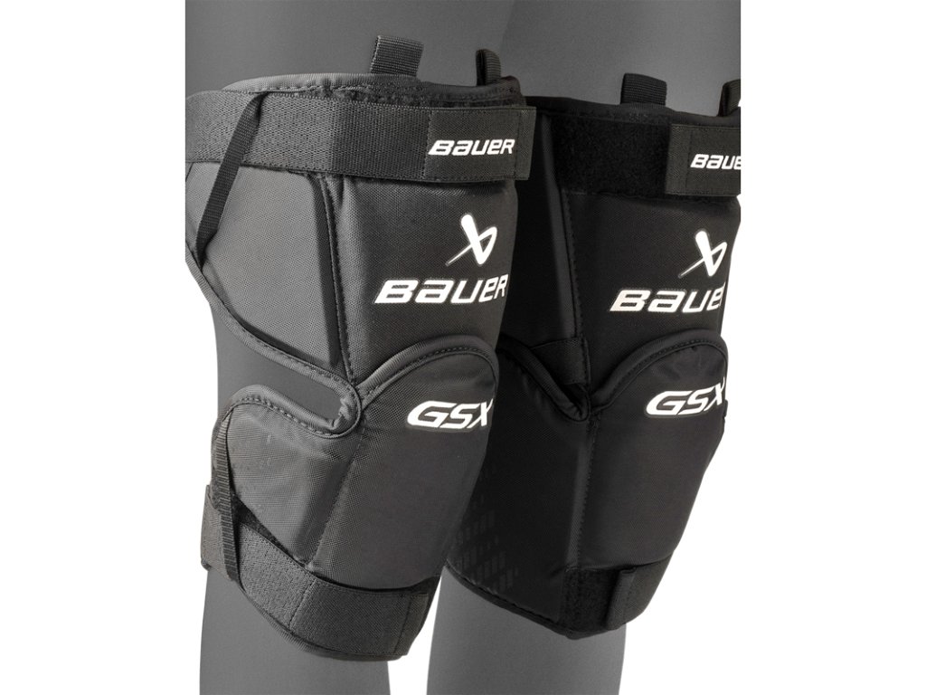 Brankářské chrániče kolen Bauer GSX s velmi dobrou úrovní ochrany díky použití lehké ochranné pěny s vysokou hustotou. Chrániče umožňují velmi dobrou pohyblivost díky dvojdílné konstrukci, která neomezuje brankáře v pohybu, díky zapínání se dvěma elastickými pásky bezpečně a jistě přiléhají k noze. Vnitřní podšívka Bauer Thermo Max+ rychle odvádí pot a vlhkost od těla a zároveň bojuje proti bakteriím způsobujícím zápach.