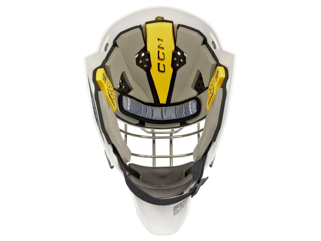 - Vnitřní výstelka masky je tvořena osvědčeným pěnovým materiálem VN (Vinyl Nitrile), který eliminuje účinky nárazu pukem do masky a zároveň zajišťuje vysoké pohodlí pro brankáře i při dlouhodobém používání