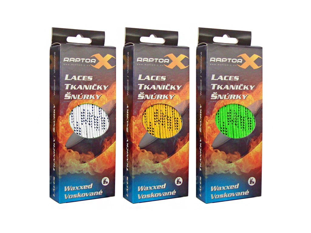 NOVINKA. Kvalitní voskované tkaničky Raptor-X. Balení v krabičce po 1 páru. Výhoda voskovaných tkaniček je především v tom, že se při utahování tolik nepovolují jako bavlněné tkaničky, a v neposlední řadě mají také delší životnost.