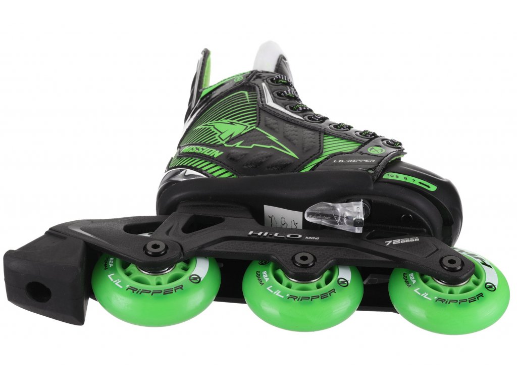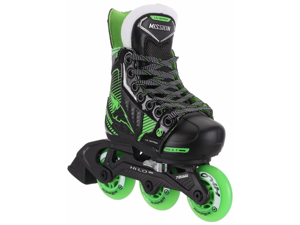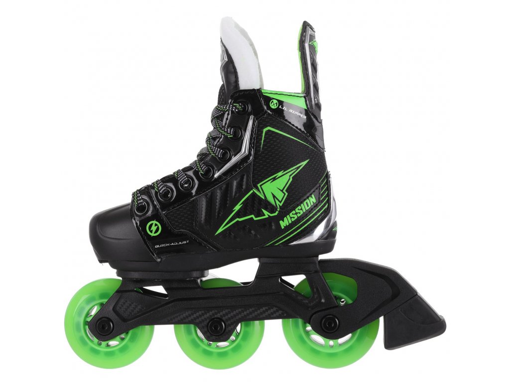 NOVINKA. Atraktivní in-line brusle Mission s nastavitelnou velikostí pro nejmenší bruslaře. Komfortní a pevná bota je vhodná nejen pro in-line hokej, ale i pro běžné fitness bruslení. Velmi jednoduché a rychlé nastavení velikosti povolením pojistky a posouváním špičky brusle.