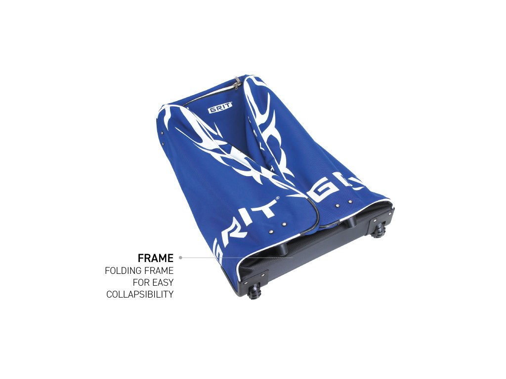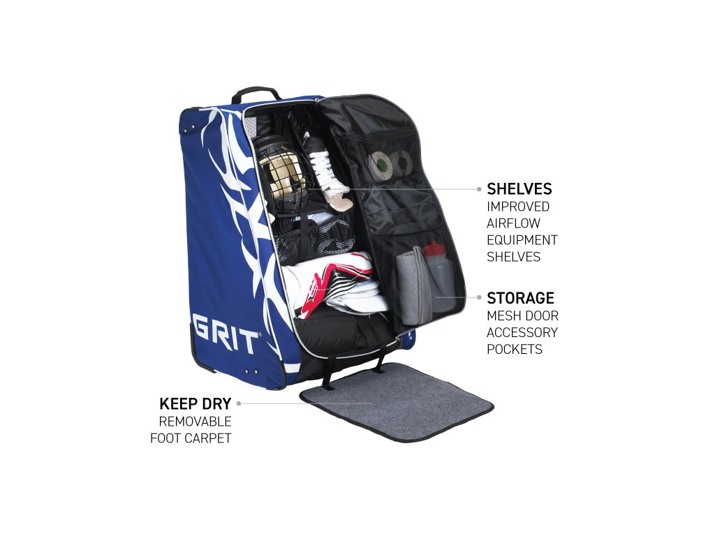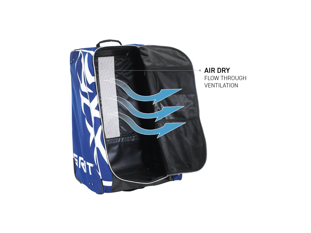 Luxusní hokejová taška na kolečkách. Taška s praktickou konstrukcí, která umožňuje jak pohodlné převážení kompletní hráčské výstroje, tak přehledné uložení výstroje pomocí oddělených přepážek. Tašku lze snadno převážet díky trvanlivým a odolným kolečkům s dezénem do všech terénů, lze ji přenášet pomocí zesílené látkové rukojeti na boku tašky a velká výhoda je především možnost postavení tašky na výšku. To oceníte především v menších šatnách, ale příjemný je v tomto případě i velmi snadný a přehledný přístup do tašky.