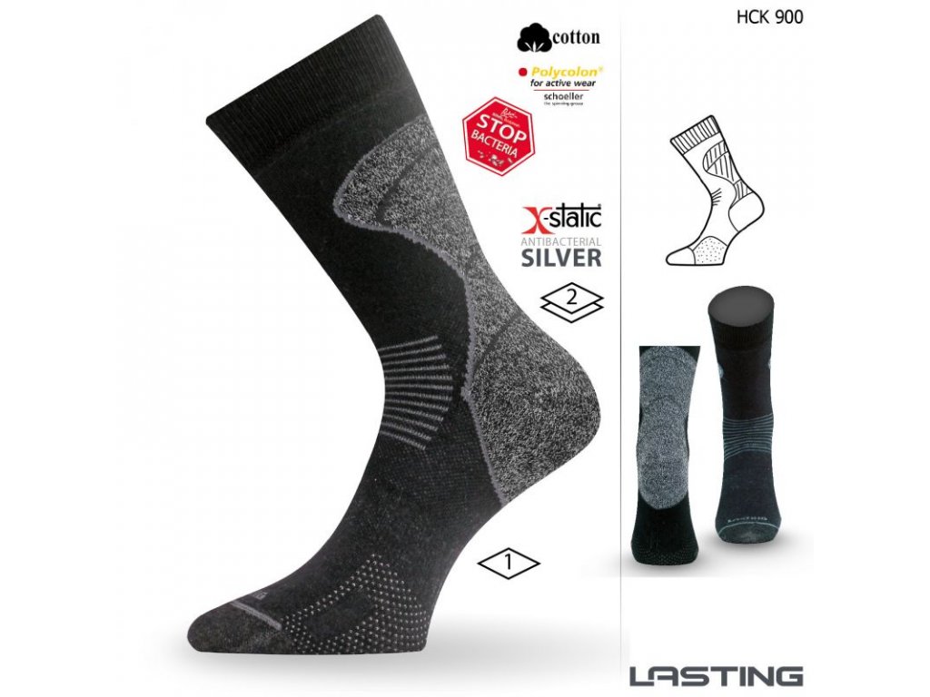 Lasting HCK jsou tenčí hokejové ponožky, obsahující bavlnu a speciální polypropylenové příze s obsahem iontů stříbra, které zpomalují růst bakterií a plísní. Potlačují nepříjemné pachy a udržují rovnováhu pokožky. Ponožky jsou upraveny pro zlepšenou ochranu proti puchýřům a tepelnou izolaci. Materiál POLYCOLON - polypropylen je hydrofobní a velmi rychle schne.