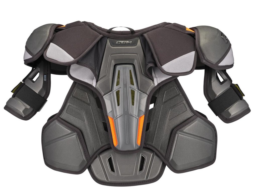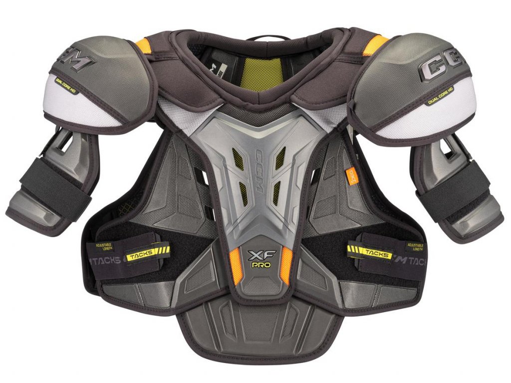 Nejnovější profesionální TOP chrániče ramen CCM z modelové řady TACKS. Chrániče se špičkovým provedením, využívající nejnovější technologie a nejmodernější materiály, díky nimž je zajištěna dokonalá ochrana i maximální pohodlí pro samotné hráče. Anatomický střih chráničů zabezpečuje perfektní usazení chráničů na těle při jakémkoli pohybu hráče. Nová konstrukce CCM Amplified Mobility Design spolu s využitím speciální pěny Zotefoam® a novým AER-TEC termoregulačním systémem dovoluje rychlým a hbitým hokejistům plný rozsah pohybu, takže mohou být na ledě nejrychlejší, navíc díky své nenasáklivosti nezvyšuje hmotnost chráničů.